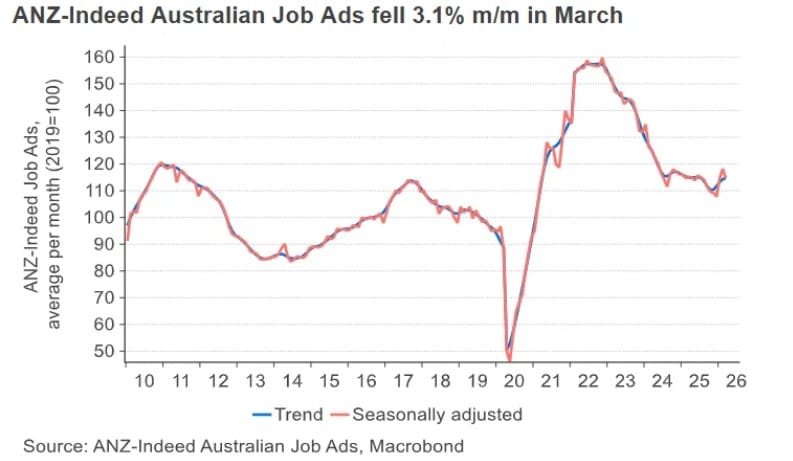 The ANZ-Indeed Australian Job Ads series dropped 3.1% month-on-month in March, following a 3.2% rise in February.